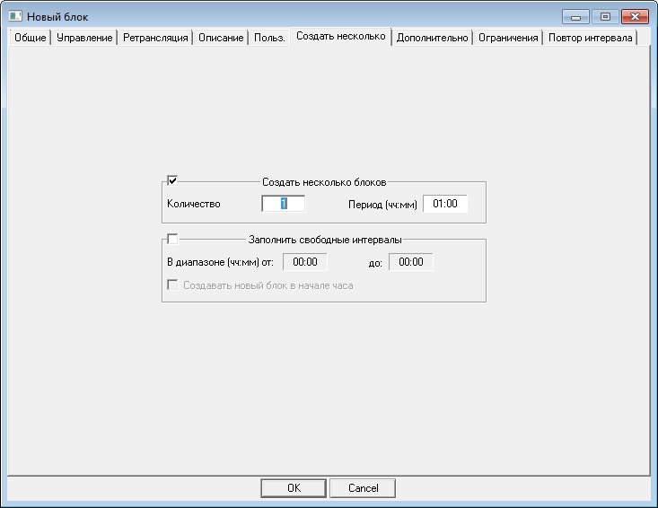 - Период (чч:мм) — задается период времени (часы, минуты), в пределах которого будут созданы блоки.