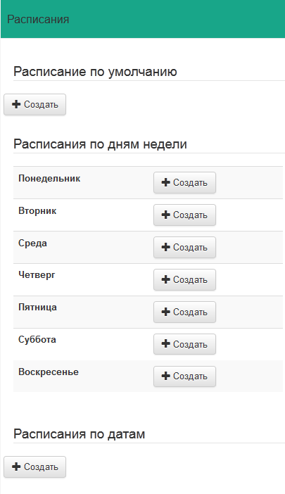 > Примечание. Название расписания будет устанавливаться автоматически и соответствовать времени действия: "Расписание по умолчанию" будет наименоваться "default", "Расписание по дням недели" — "monday", "tuesday" и т.д., "Расписание по датам" — "год-месяц-день".