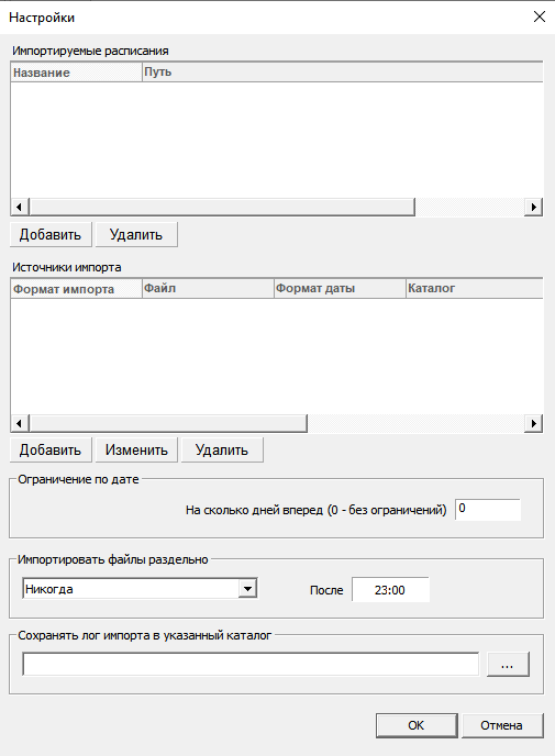 Импортируемые расписания - указываются расписания, в которые будет осуществляться импорт из внешнего файла.