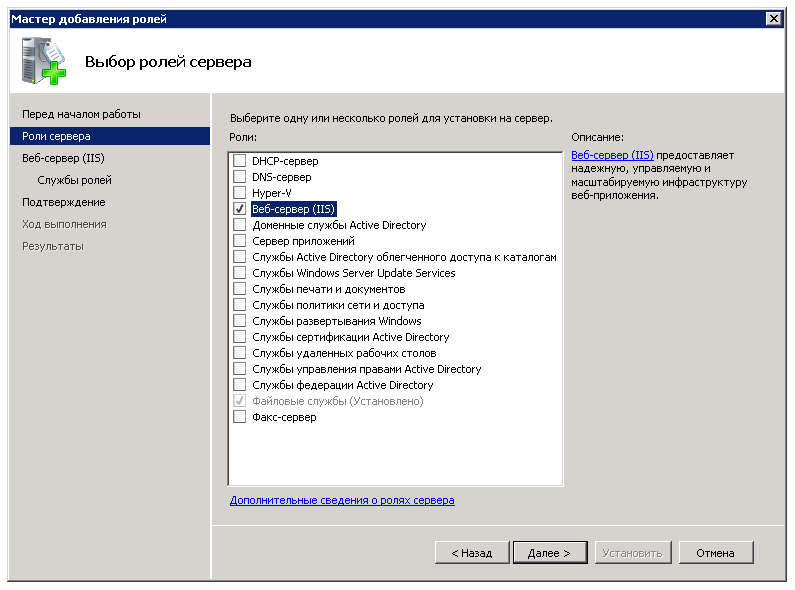 Выбрать роль Веб-сервер (IIS):