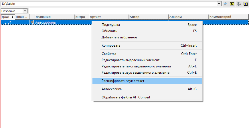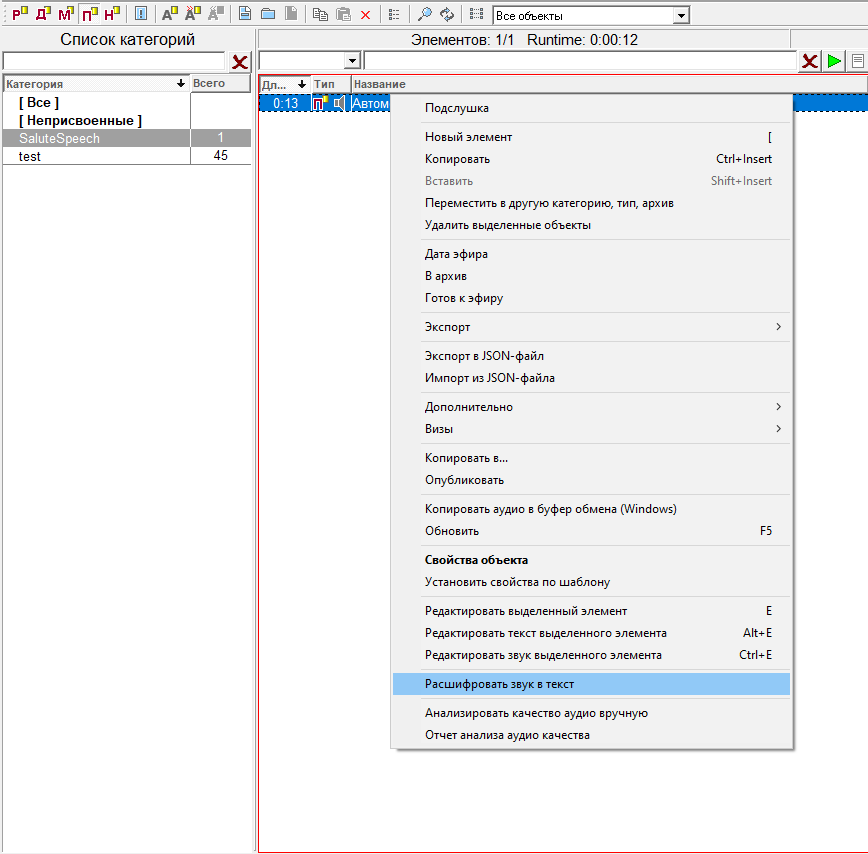 Для расшивровки элемента МБД необходимо выбрать его в окне БД, нажать правой кнопкой мыши и в контекстом меню выбрать пункт Расшифровать звук в текст: