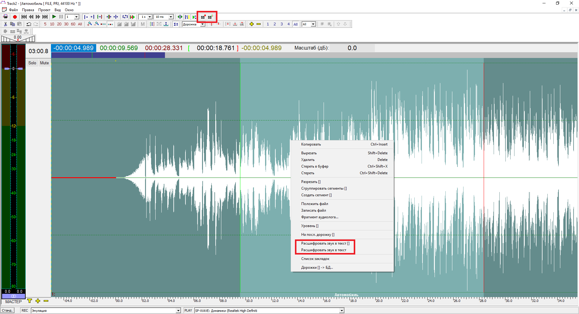 В Трек-2 для расшифровки всей фонограммы необходимо кликнуть по сигналограмме правой кнопкой мыши и выбрать из контекстного меню пункт Расшифровать звук в текст, а для расшифровки фрагмента между маркерами необходимо выбрать пункт Расшифровать звук в текст []. Также указанные функции продублированы кнопками в верхней части окна приложения: