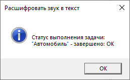 Если используется формат Моно, то в результате расшифровки будет получен общий результат распознавания; - Выводить сообщение после завершения задачи - вывод результата завершения расшифровки звука, возможные значения: Всегда, Никогда, Только при наличии ошибок;