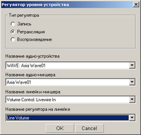 Необходимо установить переключатель Тип регулятора в положение Ретрансляция, и выбрать необходимое аудиоустройство и название аудиомикшера. Номер аудиомикшера должен совпадать с номером аудиоустройства. В списке Название линейки микшера необходимо выбрать Volume control: Livewire In, а название регулятора – Line Volume.