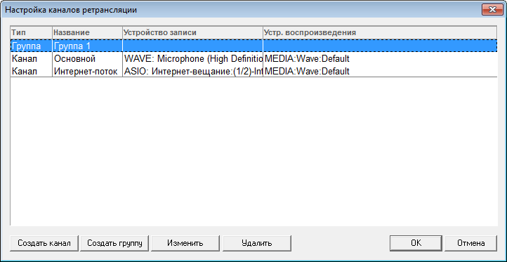 - Изменить позволяет изменить параметры существующего канала ретрансляции или группы каналов. Открывает, соответственно, окно Параметры канала ретрансляции или Свойства группы.