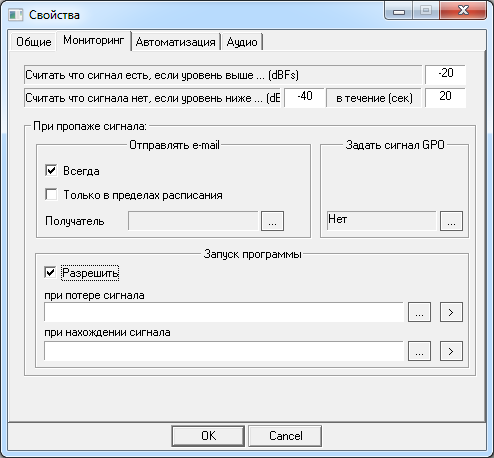 - Считать, что сигнал есть… (Signal is present if its level is higher than …); Считать, что сигнала нет… (Signal is not present if its level is lower than …) и В течение (сек) (in (sec)) — это настройки детектора наличия сигнала. Информация о наличии / отсутствии сигнала используется при автоматической записи, а также для оповещения о пропадании/появлении сигнала посредством посыл-ки e-mail.