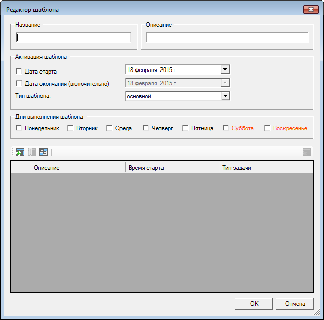 Шаблон представляет собой набор задач, для которых указаны дни и время выполнения, а также день, начиная с которого шаблон начнет действовать. Шаблон действует с 0:00 до 24:00 часов в течение указанного дня.