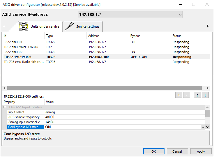 - Card Bypass I/O state позволяет включить (ON) или отключить (OFF) прямой вывод аудиопотока со входа на выход на плате TP-322 (новая прошивка)