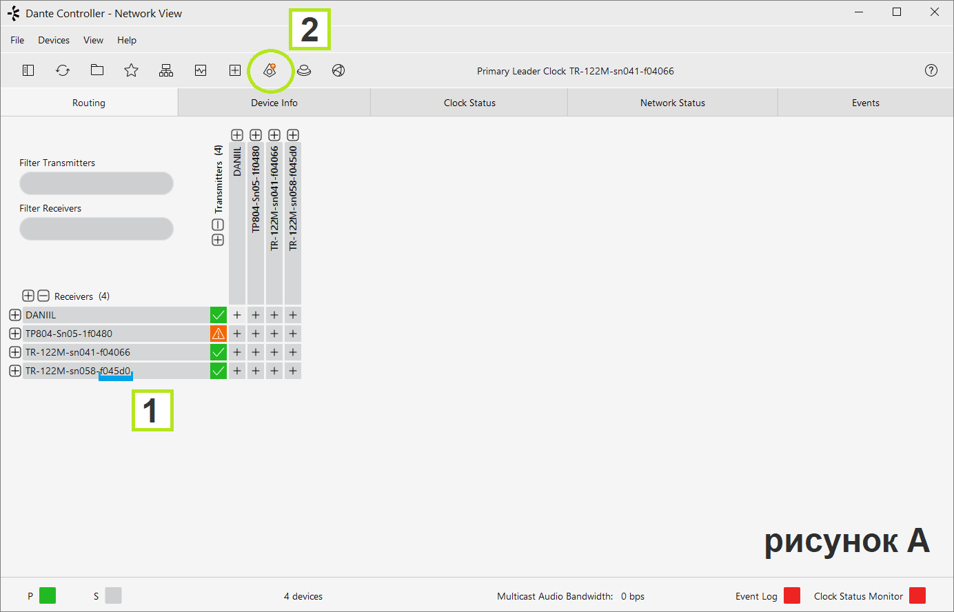 - Когда Dante Controller обнаружил нужный блок, кликом по иконке ромба в строке инструментов открыть Dante Updater (рисунок А, [2]);