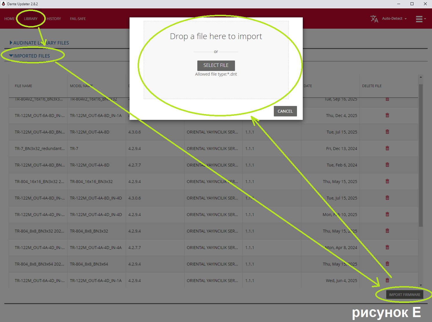 перейти на вкладку Library в шапке окна > раскрыть строку Imported Files > нажать кнопку Import Firmware и в открывшееся окно загрузить файл прошивки (рисунок E);