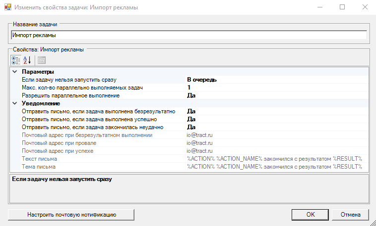 Если задачу нельзя запустить сразу — здесь можно указать, что делать, если задачу нельзя запустить сразу (например, если какое-то действие должно быть выполнено несколько раз, и во время запланированного запуска задачи предыдущее действие еще продолжает выполняться). Возможные значения: В очередь — задача будет поставлена в очередь, дожидаясь выполнения предыдущей задачи или Отклонить — задача будет отклонена.