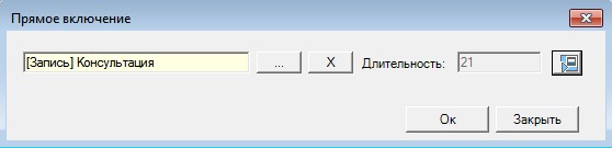 Прямое включение — это «виртуальный» тип рекламного элемента, формирующий в эфирном расписании информационную строку. При добавлении прямого включения открывается форма, куда можно добавить либо фонограмму, либо текст, который ведущий прочитает в прямом эфире в заданное информационной строкой время. Если добавляется фонограмма (Запись), то кнопка