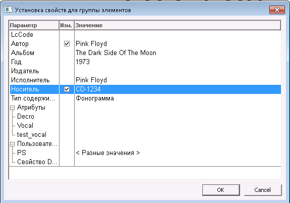 В случае, если у выбранных в МБД элементов разные значения какого-либо свойства, например, разные исполнители, то значение этого свойства будет отображаться строкой *< Разные значения >*.