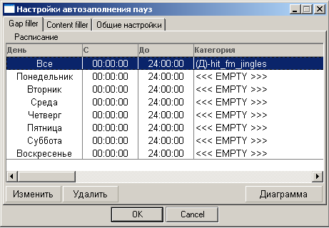 Окно Настройки автозаполнения пауз (Рис. 1) открывается командой Настройка системы заполнения пауз меню окна Расписание (доступ к меню осуществляется посредством кнопки ).
