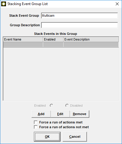 Теперь создадим в Pathfinder процедуры, которые будут изменять состояние GPIO в зависимости от уровня сигнала. Для этого на вкладке Stacking Events Нажимаем кнопку "Add Stack Group" для создания отдельной группы таких процедур. Откроется окно Stacking Event Group List. В поле Stack Event Group присвоим имя новой группе событий, например, Multicam.