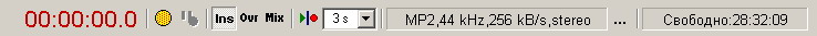 На панели записи отображается текущий формат записи, длина записанного фрагмента и доступный объем дискового пространства в формате ЧЧ:ММ:СС. Последние два индикатора динамически обновляются по ходу записи. Управление процессом осуществляется с помощью следующих элементов: