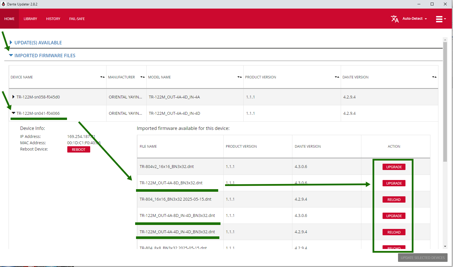 - При первом запуске ПО Dante Updater надо будет добавить прошивки