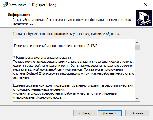 После установки ПО необходимо поместить файлы лицензий KeyDll_7.dll, Licence.info и Mag.ini(Входят в состав поставляемого ПО) в каталог установки программы, например: C:\Program Files (x86)\Digispot II\Mag. Также необходимо создать корневой каталог комплекса — ROOT, например: \\hostname\ROOT и поместить в него файлы системной лицензии KeyDll_7.dll, Licence7.sys.info и System Licence.ini.