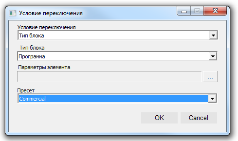 Кнопка Создать позволяет добавить новое условие автоматического переключения: необходимо выбрать условие подключения, тип блока, пресет и нажать Ок.