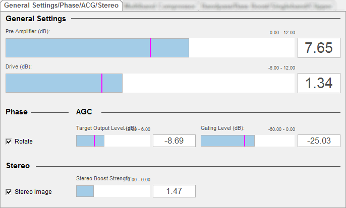 1. General Settings/Phase/AGC/Stereo. На данной вкладке можно быстро настроить основные параметры всего модуля. Настройки обеспечивают регулировку усиления входного сигнала при его низком уровне, а также предоставляют возможность настроить глубину и силу динамической обработки звука алгоритмами аудиопроцессора одним движением. На странице также представлены настройки модуля коррекции фазы входного сигнала, основные настройки двухполосного АРУ (AGC) и «улучшайзера» стереопанорамы Stereo Image.