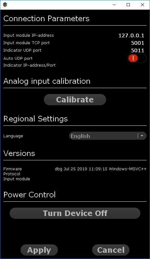 • Section "Connection parameters": IP-address and port of the input module connected to the computing device (indicator unit); "UDP port" - a port on the computing device itself, where the input module sends audio streams; IP address and port on the indicator unit, connected to the input module.